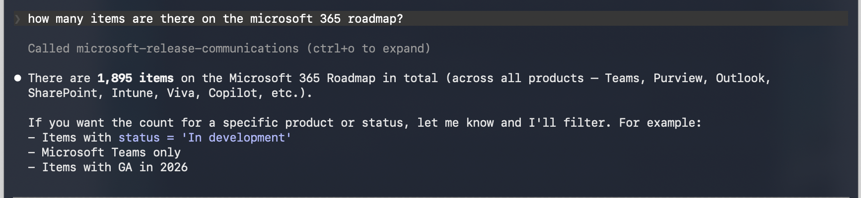 From here, you can now query the Microsoft 365 of the Azure Roadmap using regular English phrasing.