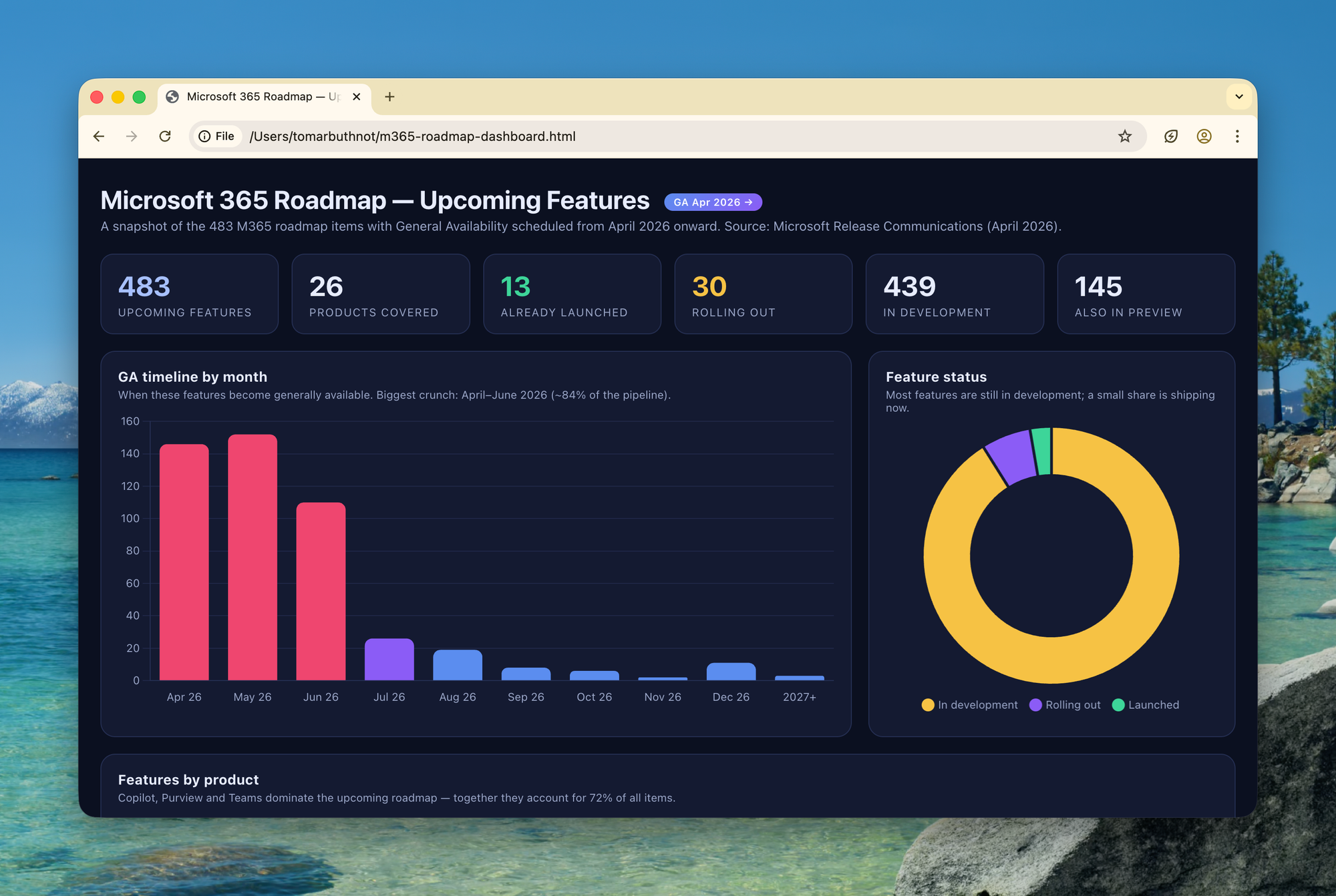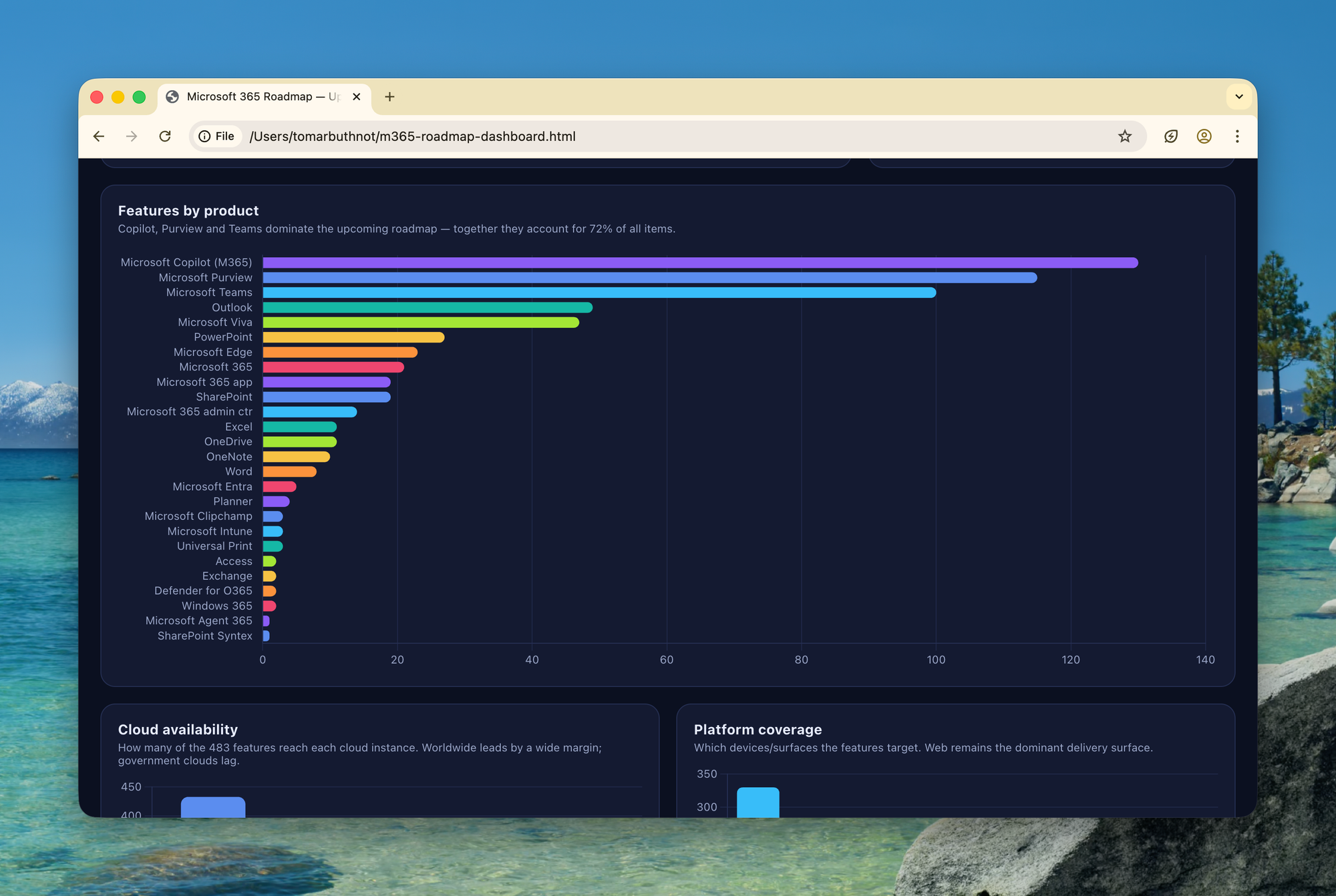 products— Product(s) the feature belongs to: Microsoft Teams, SharePoint, Outlook, Purview, Microsoft Copilot, Exchange, OneDrive, Planner, Intune, Viva, Whiteboard, Word, Excel, PowerPoint, and more. A feature can belong to multiple products.platforms— Where the feature runs: Desktop, Mac, Web, iOS, Android, Linux, Mobile, Teams and Surface Devices, Education, Developer.cloudInstances— Which Microsoft cloud environments support it: Worldwide (Standard Multi-Tenant), GCC, GCC High, DoD. Important for government and regulated tenants.